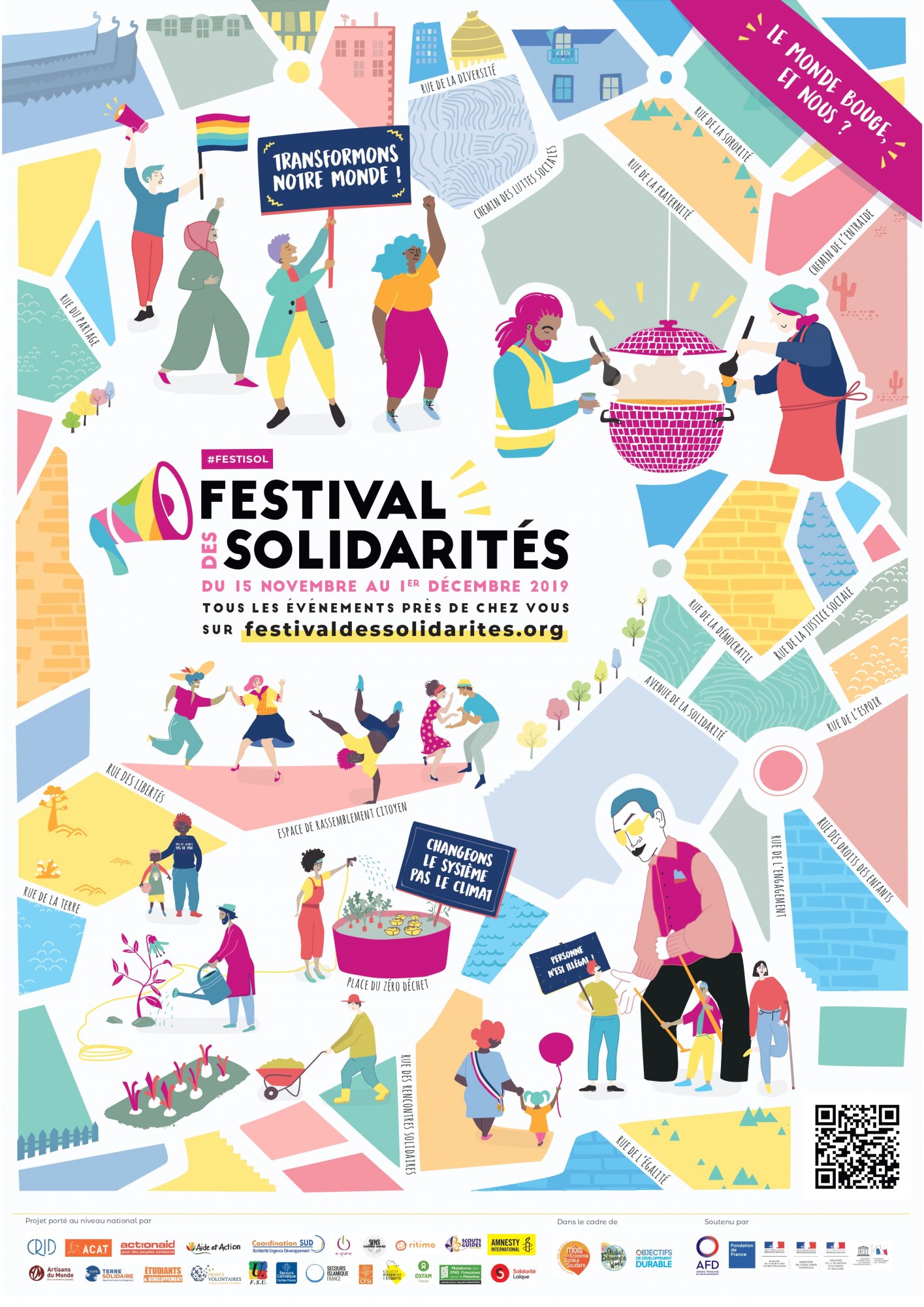Depuis 22 ans, à partir de la troisième semaine de novembre et pour deux semaines, a lieu partout en France le Festival des solidarités. Il met en lumière les démarches des nombreux acteurs qui s’engagent sous des formes multiples pour construire un monde plus juste, plus solidaire et durable. Des associations, des artistes, des établissements scolaires, des collectivités, des structures socio-culturelles, des citoyen·ne·s organisent à cette occasion, sur l’ensemble du territoire, des milliers d’animations, de débats, de performances artistiques et culturelles qui sont autant d’illustrations concrètes des pratiques de solidarité et d’appropriation de l’espace politique.